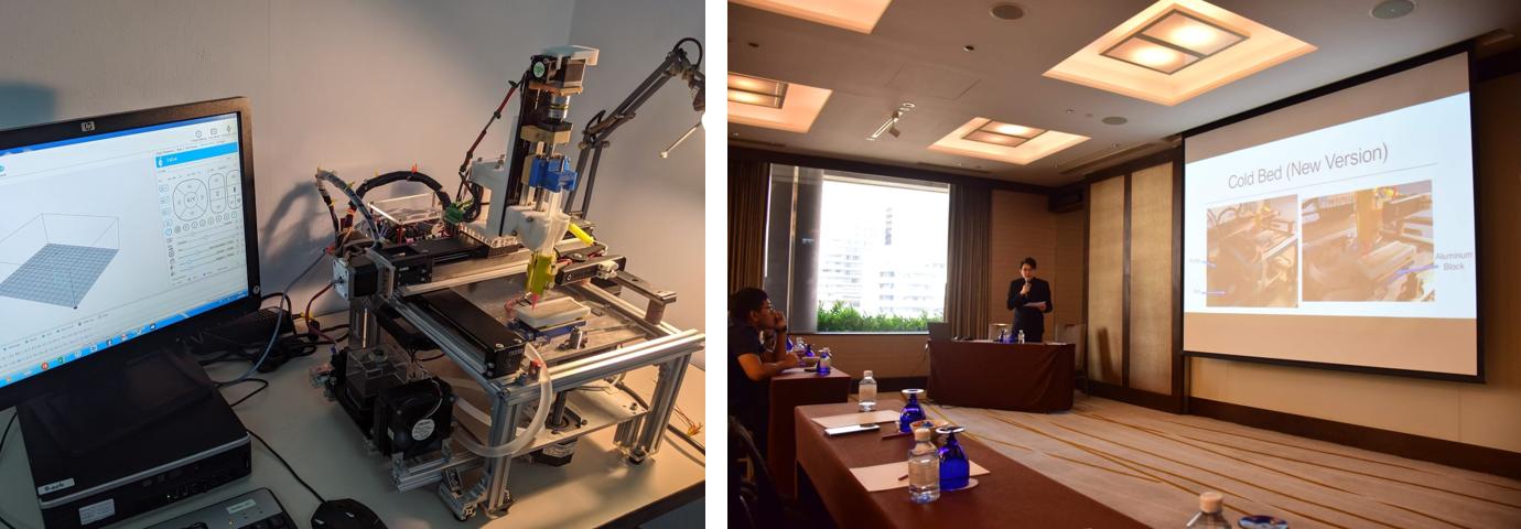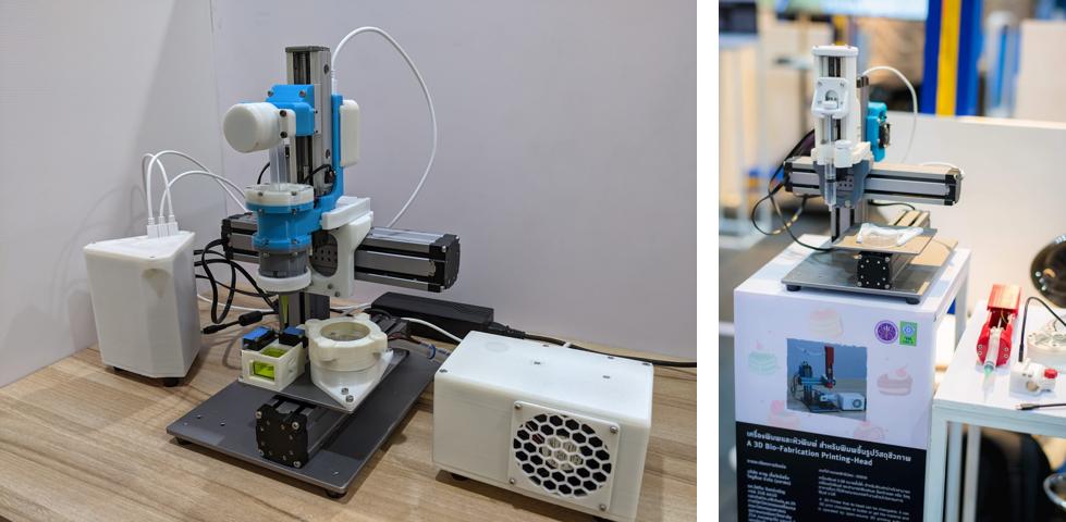 3rd generation of the 3D bioprinter with an expanded range of print bed temperature control and nozzle calibration system (Left). My 3D bioprinter on display at Thailand’s Inventor Day in 2022 (Right).