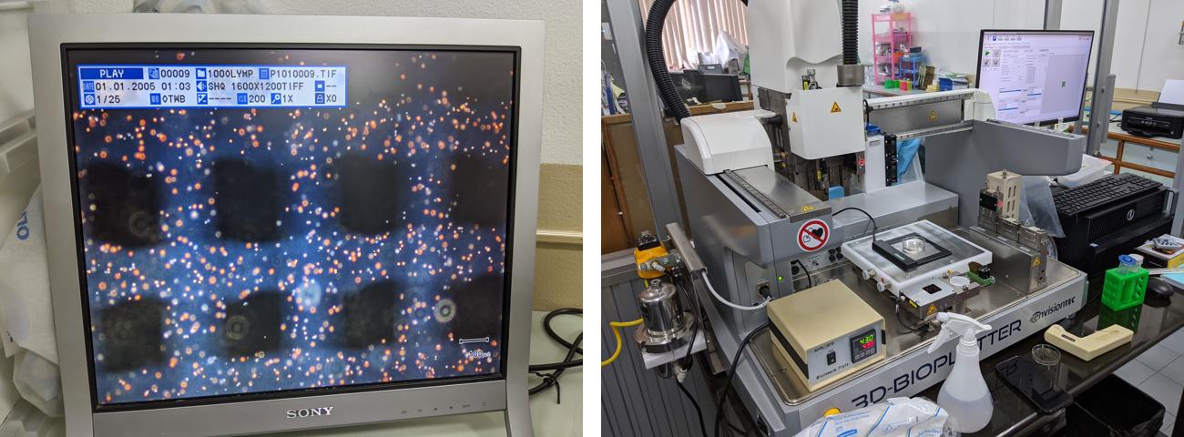 Dog keratinocyte cell encapsulated in collagen type I scaffold and dye with phenol red (Left). EnvisionTEC’s 3D-Bioplotter (Right).