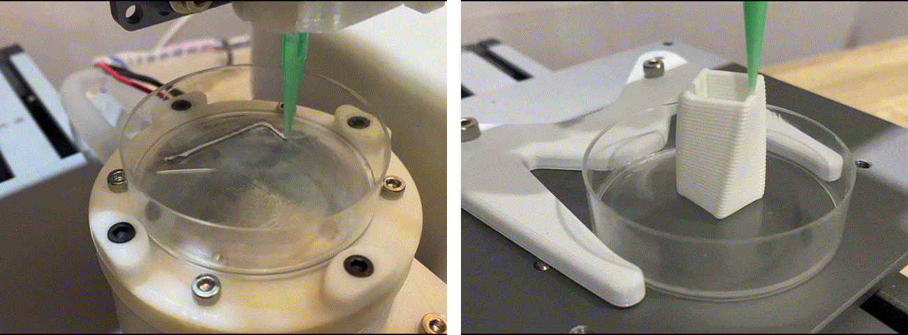 The printing of gelatin hydrogel (Left) and silicone sealant (Right). Demonstrating the flexibility of the extruder with a wide range of materials. The hydrogel is printed with a heated syringe pump extruder on the cold print bed.