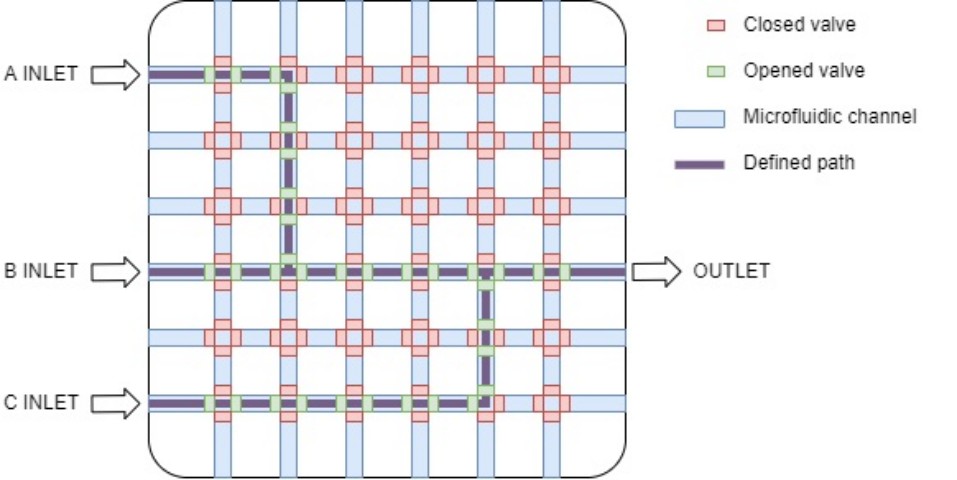 The reconfigurable microfluidic device concept example consists of several vertical and horizontal microfluidic paths. At each junction are located four microfluidic valves. The valves shown in green are opened to form a path as illustrated by dark grey lines. The current part allowed a mixture of chemicals A and B then chemical C is added later. The mixture exited the device on the right side.