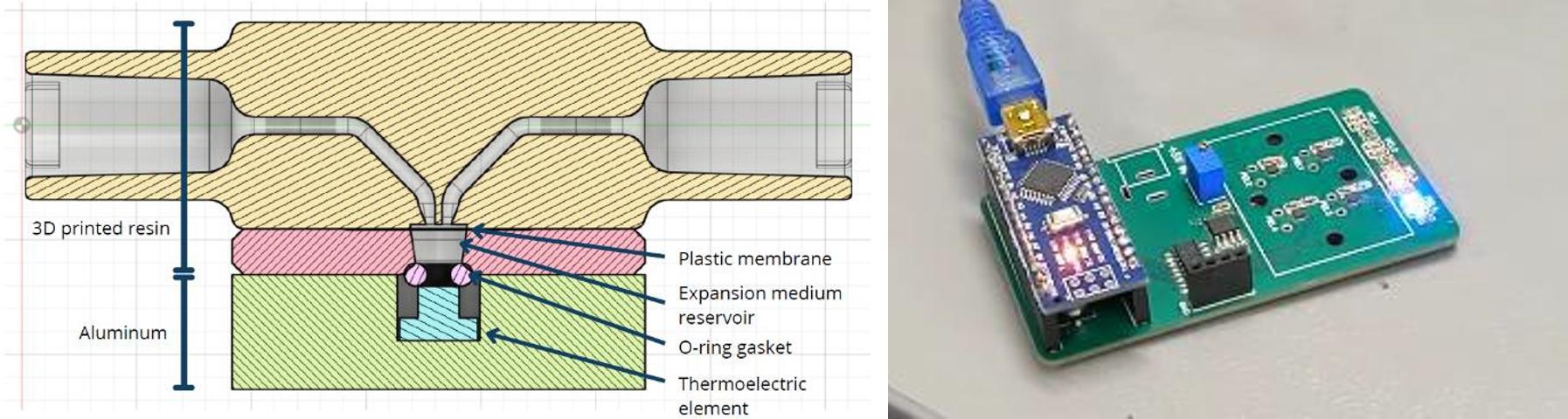 Detailed design of Peltier Driven Thermal Actuated Microfluidic Valve Prototype (Left). Fully assembled PCB (Right). The PCB is connected to the computer via a USB cable. In this picture, the LED array states that the PCB is signaled to close valve number 3 (red light), and open valve number 4 (blue light). The PCB is modular and can be cascade with others to control large network of valves.