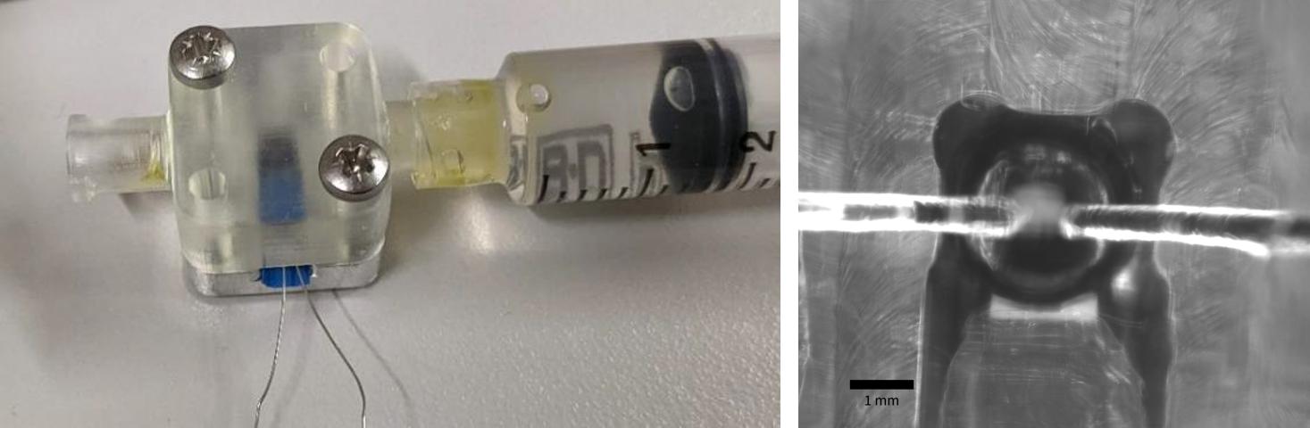 The assembly of the Peltier-driven thermal actuated valve (Left). The syringe is connected to the right side of the valve as an inlet for the liquid. Top-view image of the valve from a light microscope (Right).