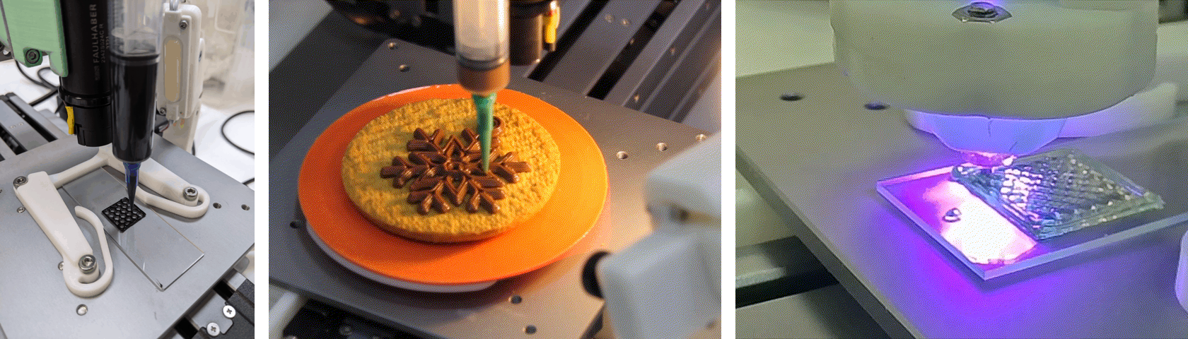 The 3D printing of silicone sealant (Left), chocolate fudge (middle), and UV resin (right).