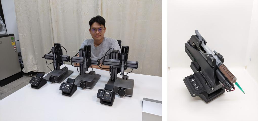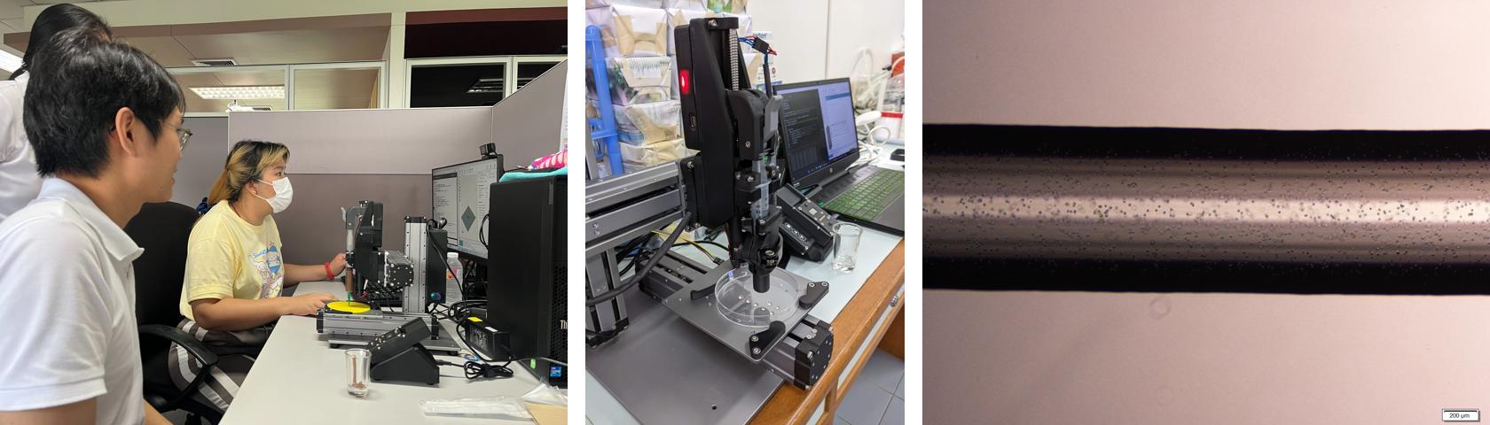 Introduction of my 3D printer to Dr. Piyarat Silapasuphakornwong (Left). My 3D printer was used for the 3D printing of biogel in the Veterinary Clinical Stem Cells and Bioengineering Research Unit, at Chulalongkorn University (Middle). The printed line of type I collagen with encapsulated mouse fibroblast L929 cells is shown as small dots distributed inside the line (Right).